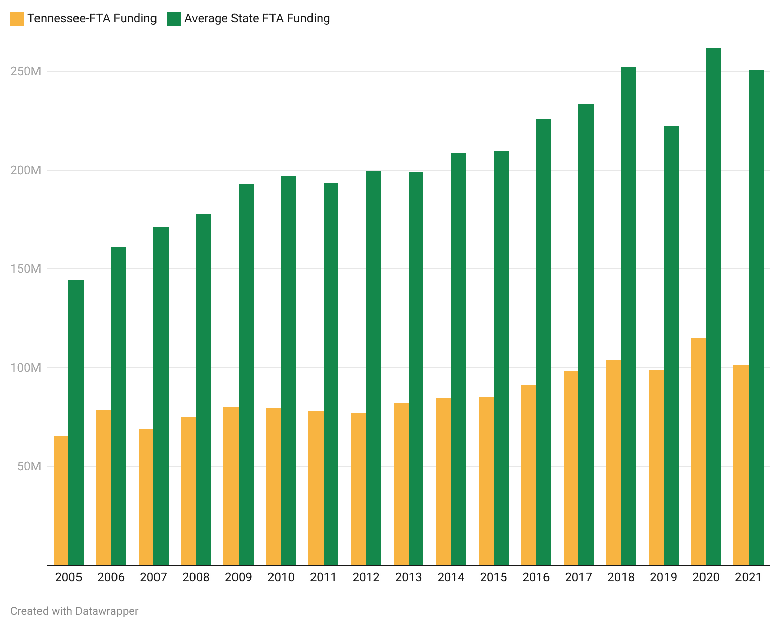 In Tennessee, our transit funding is in dire need of increased investment. The average state collected $206 million from the Federal Transit Administration (FTA) between 2005-2021, while Tennessee collected only $86.1 million during the same period. The state’s contributions to transit, which typically come in the form of operating assistance and matching funds for federal grants, are 9% lower than what other states contribute to local transit. And at the local level, none of Tennessee’s major cities have adopted dedicated funding for transit. The first and only attempt to do so was Nashville’s 2018 transit referendum.